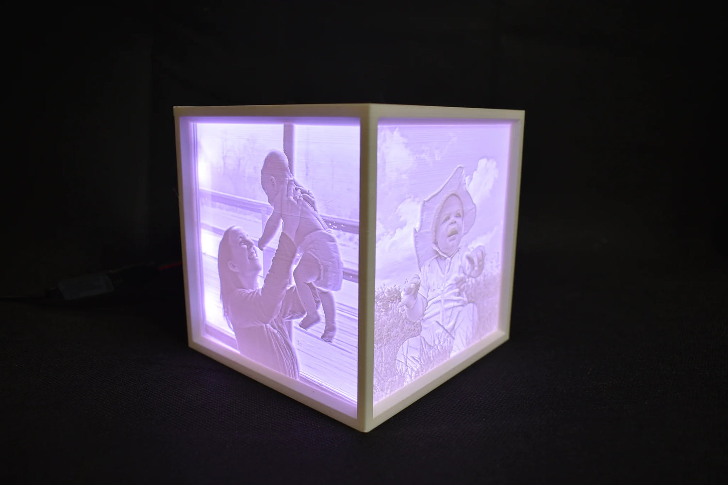 Check these Lithapane LED boxes. With 4 of your pictures, we make a custom-printed LED box for your Love One!